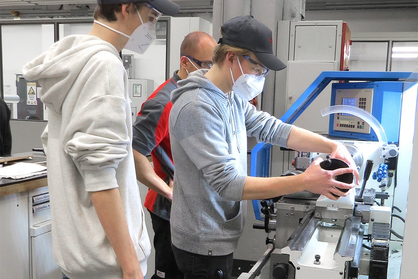 Die technikbegeisterten Jugendlichen erhalten dabei nicht nur theoretische Einblicke in die (Arbeits-)Abläufe der Projektbeteiligten. Denn an jeder Station wird diesmal ein weiteres Teil eines „Mensch-ärgere-dich-nicht“-Spiels angefertigt. Bei KAPP fand das Brettspiel seinen „Halt“, denn hier wurden die Füße gefertigt und angeschraubt.
