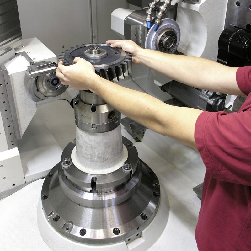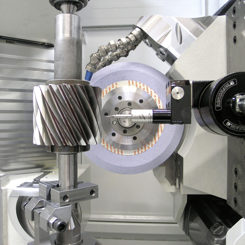 Die Profilschleifmaschine KNG 3P ready bietet im Bereich des Verzahnungsschleifens einen preiswerten Einstieg in die Präzisionsbearbeitung. Sie ist als Lösung für die flexible Fertigung kleiner und mittlerer Losgrößen konzipiert. Die Maschine zeichnet sich durch eine Schleifspindel mit hoher Antriebsleistung für Bauteile bis Modul 10 mm aus. Der direkt angetriebene Rundtisch ist großzügig dimensioniert für eine Tischbelastung bis 350 kg. Der Abrichter sitzt stationär gegenüber der Werkzeugachse und erlaubt den Einsatz kleiner Schleifscheiben bis hin zu einem minimalen Durchmesser von 65 mm. Der Arbeitsbereich kann ohne Einschränkungen bei großen Schrägungswinkeln genutzt werden. Durch die niedrige Höhe des Maschinenbettes und die kurze Distanz zu den Maschinenelementen sind alle Bedientätigkeiten ohne Hilfsmittel ausführbar.